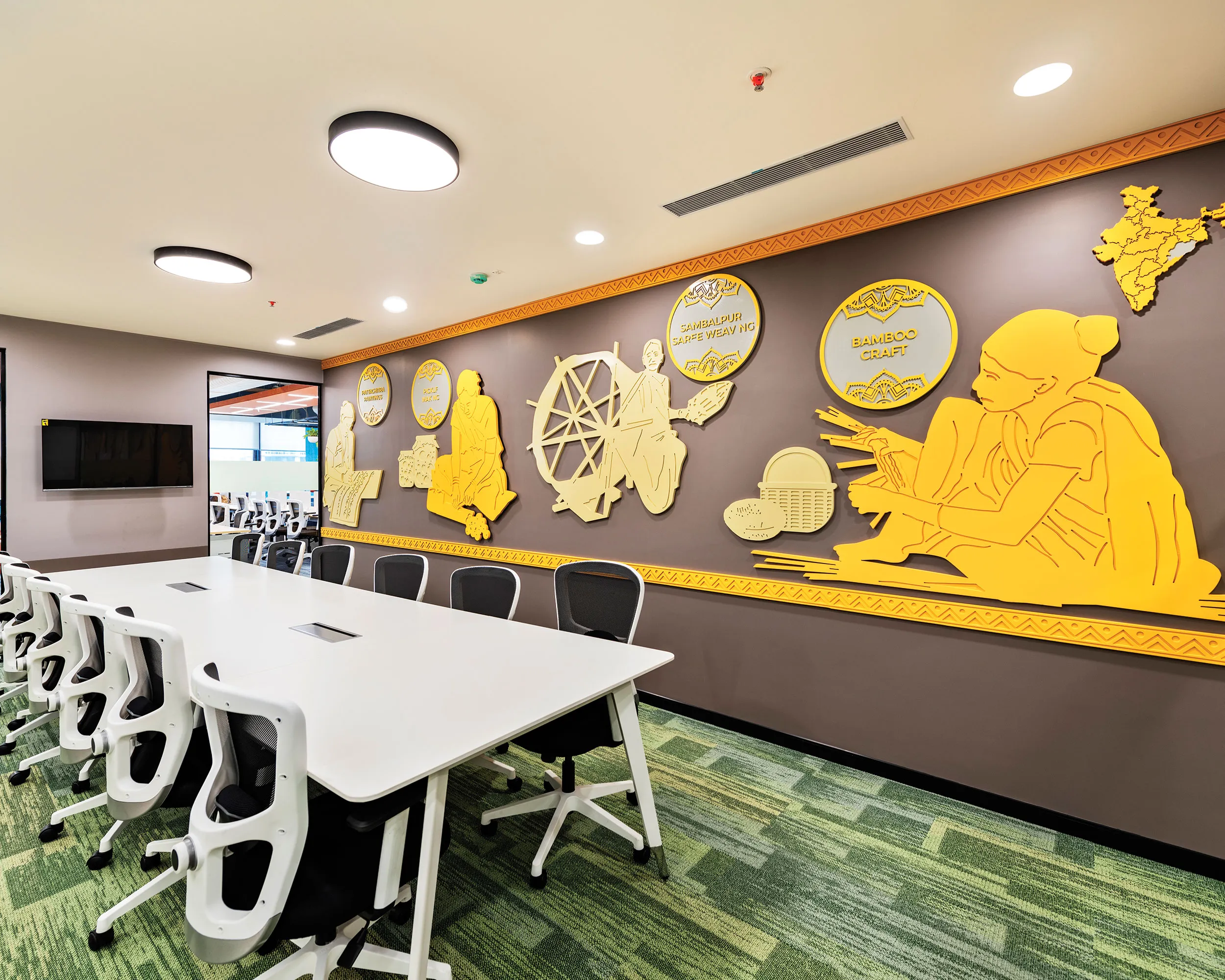Flipspaces conducted a one-month design workshop at BFIL's Hyderabad office, fine-tuning layouts and deducing sample themes through stakeholder polling. The core design thesis "Modern Rural Biophilia" was developed to integrate executive zones, meeting rooms, cabins, collaborative areas, and workstation zones into a cohesive narrative. A mock-up meeting room was created on a bare-shell floor to establish quality benchmarks before full-scale execution.