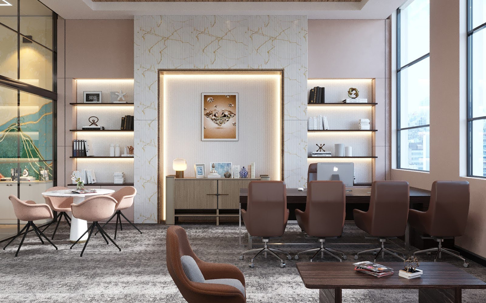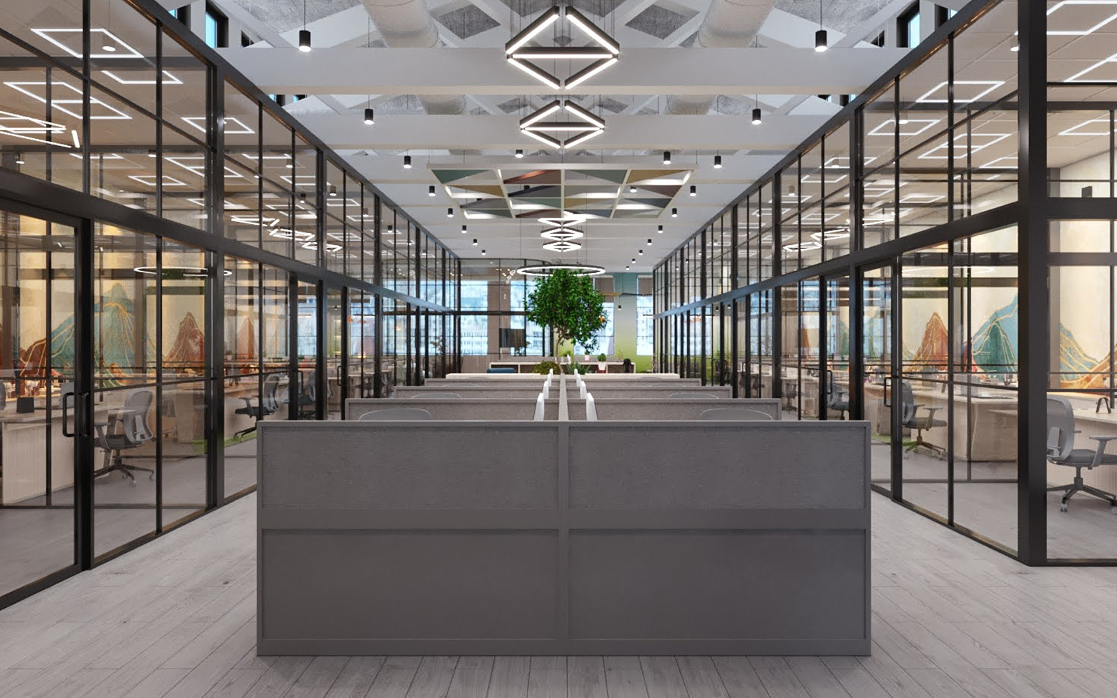 Design Theme: Industrial-luxury, diamond-inspired workspace design